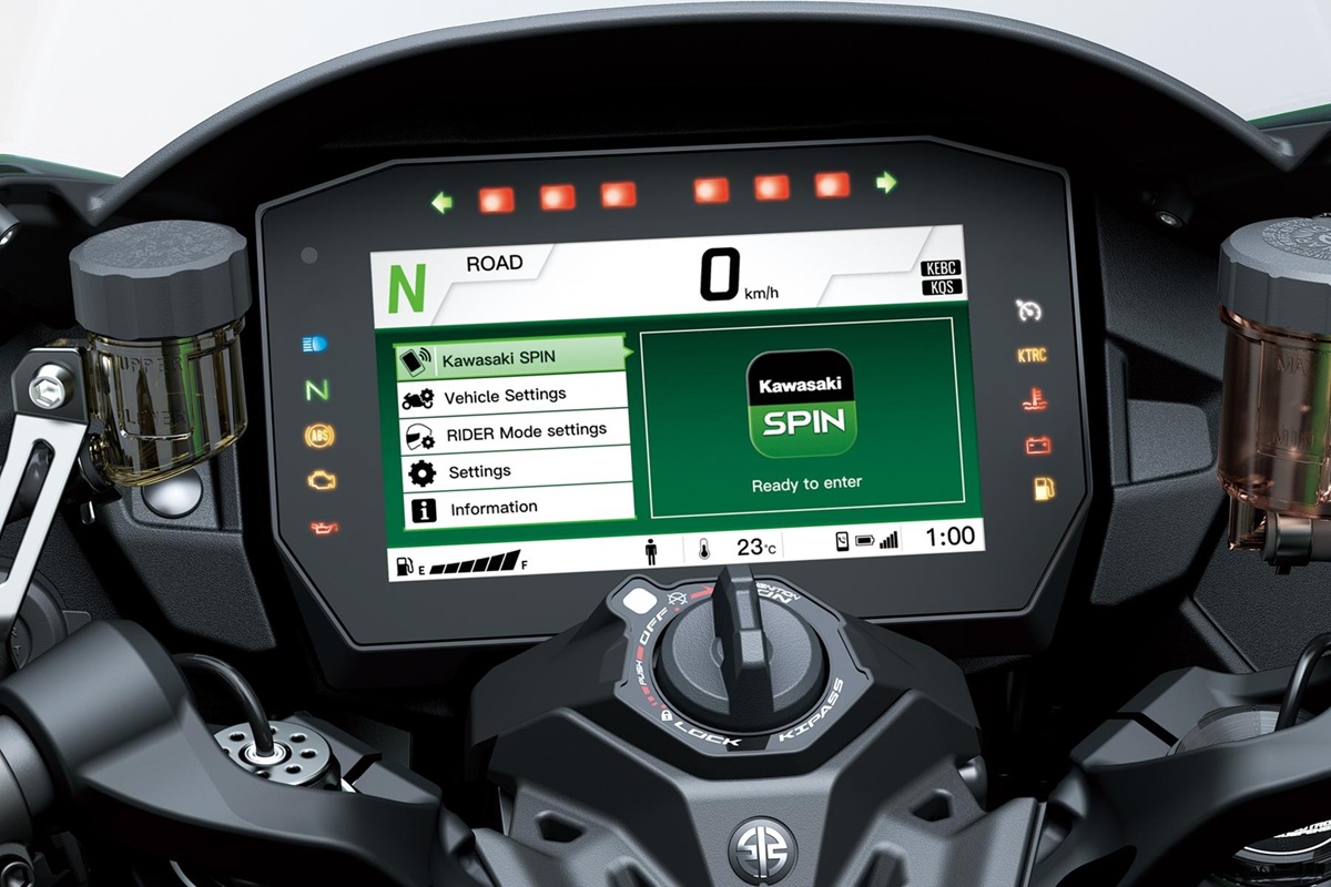 L’abitacolo è dominato da uno schermo TFT a colori da 6,5 pollici ad alta risoluzione. Attraverso il sistema Kawasaki SPIN, la moto diventa un’estensione dello smartphone, consentendo l’integrazione della navigazione, la registrazione dei percorsi e la gestione delle comunicazioni. Inoltre, include il sistema KIPASS, un avviamento di prossimità che elimina la necessità di una chiave fisica per l’accensione e il blocco dello sterzo, ottimizzando il comfort nelle frequenti soste durante i lunghi viaggi.